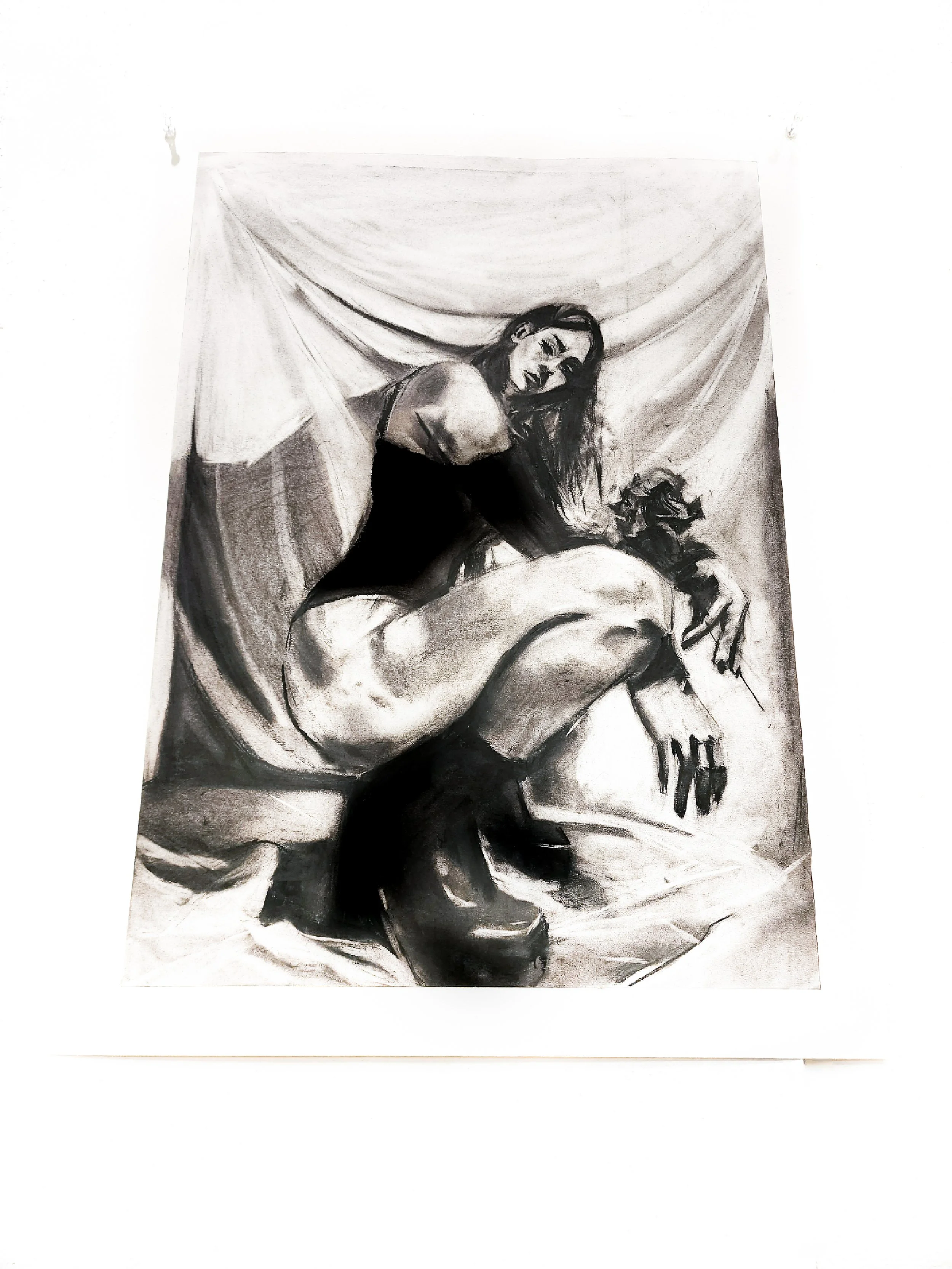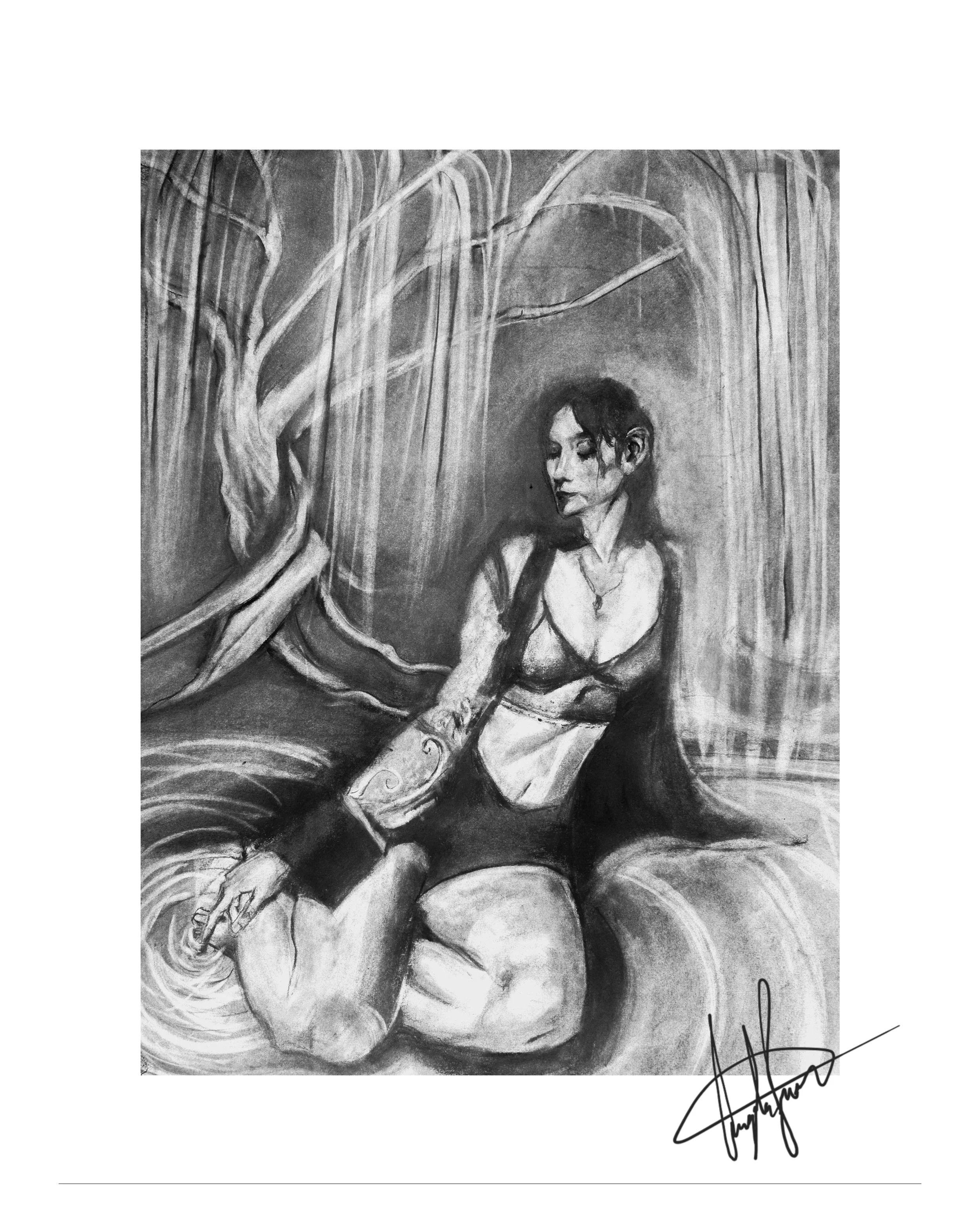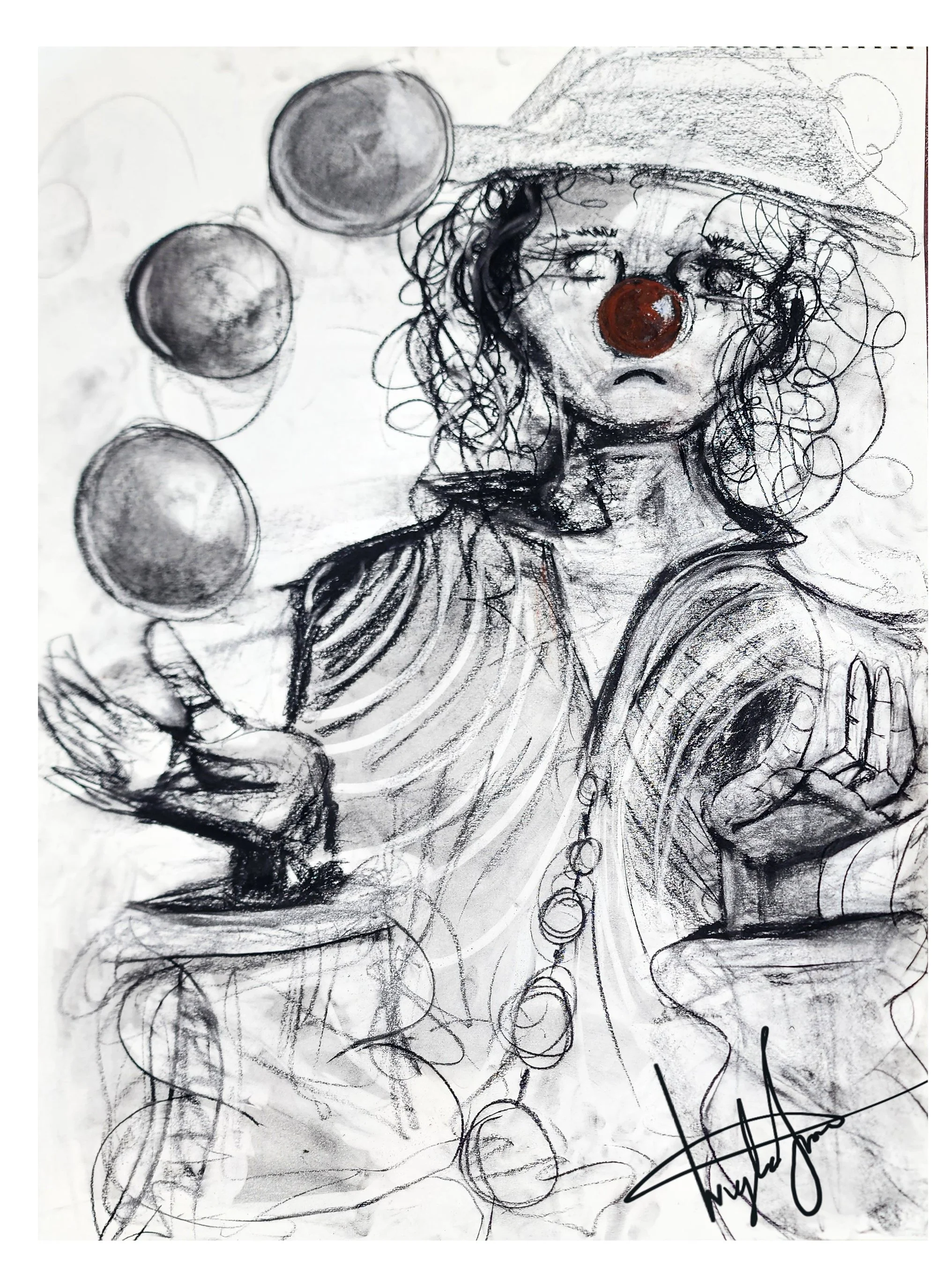 CHARCOAL DRAWINGS "Alter Ego" "Woman Laying" "Melissa" "Sad Clown" Art Is A Fight To The Finish Between Black Charcoal and White Paper-Gutter Grass Contact Artist